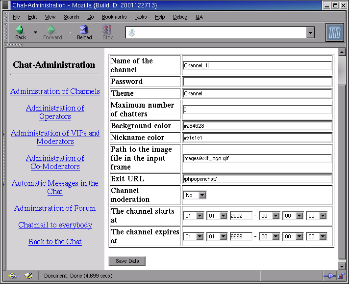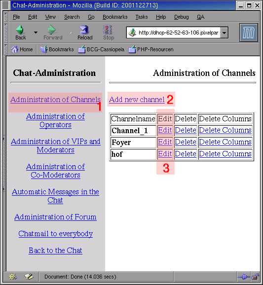 Unter dem Menüpunkt "Administration der Channels" (1) ist das Konfigurationsinterface zu erreichen.