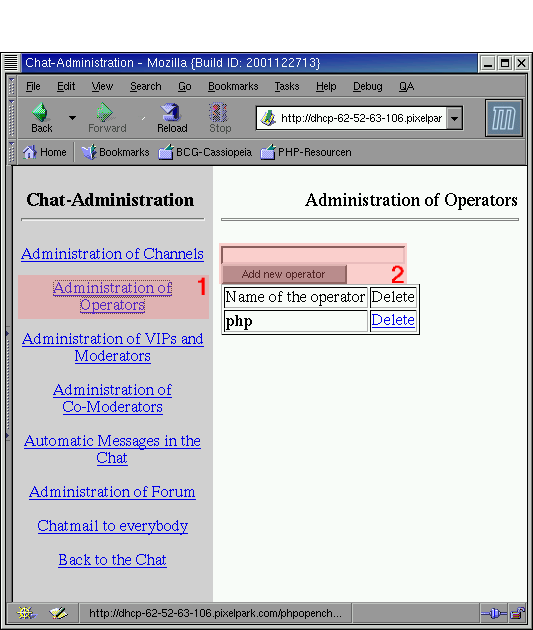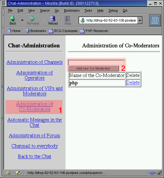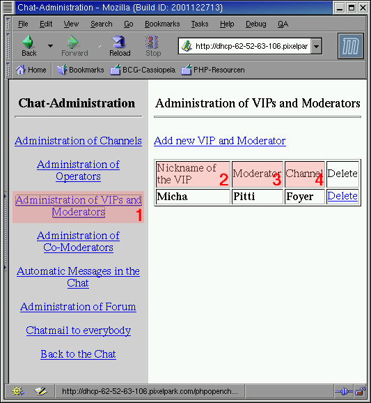 Unter (1) gelangt man zur Administration der Moderatoren und VIPs. Ein Eintrag besteht dabei aus drei Feldern:
